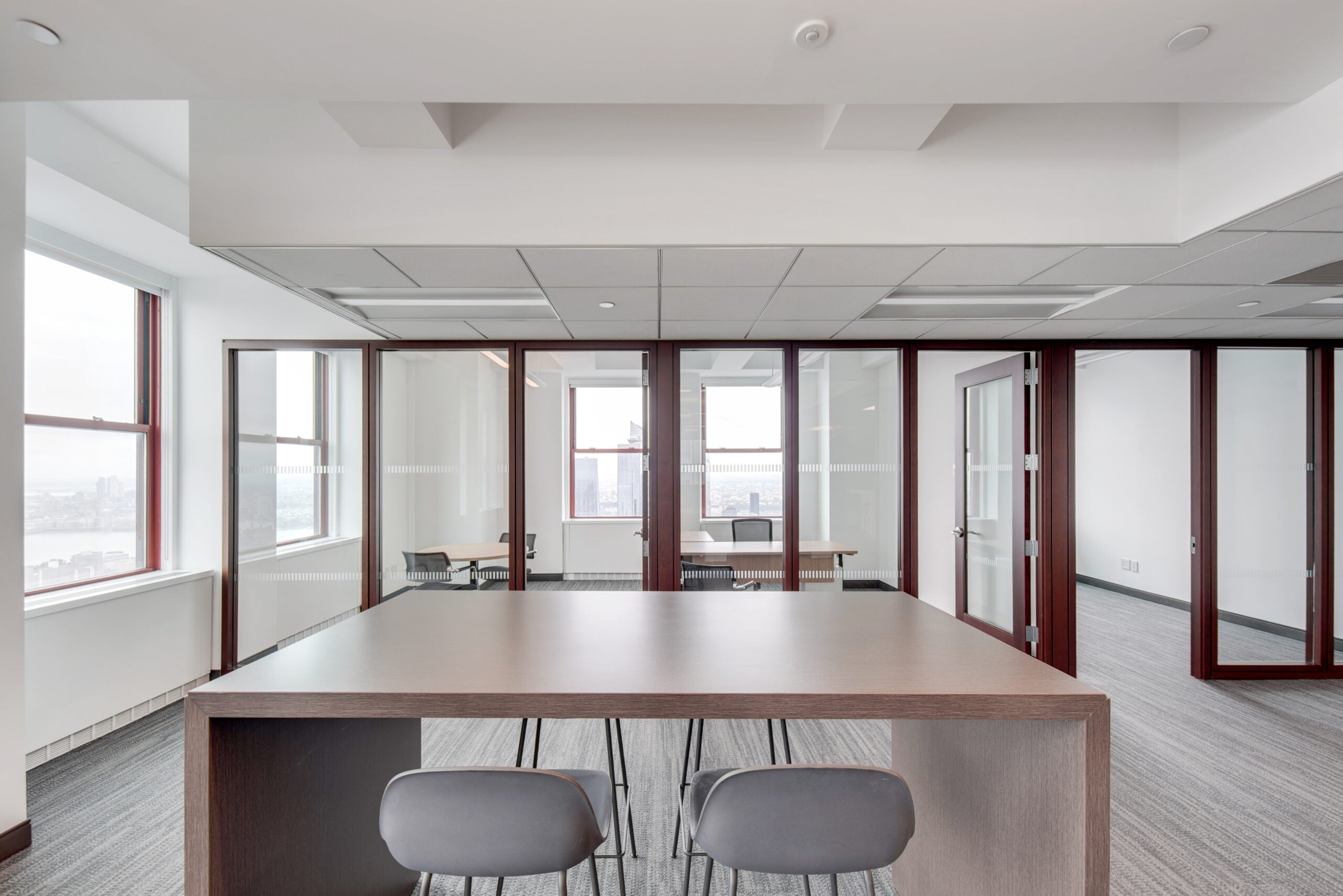 ESB’s full 32nd floor availability features luxury finishes designed by Fogarty Finger Architects and 360-degree views from the heart of Manhattan. This 25k square foot space boasts eight black metal and glass fronted offices, three conference rooms, 10 meeting rooms, two phone rooms, and room for 111 workspaces. Common areas include a state-of-the-art pantry with wood and marble finishes, exposed ceilings and columns, and polished concrete floors.