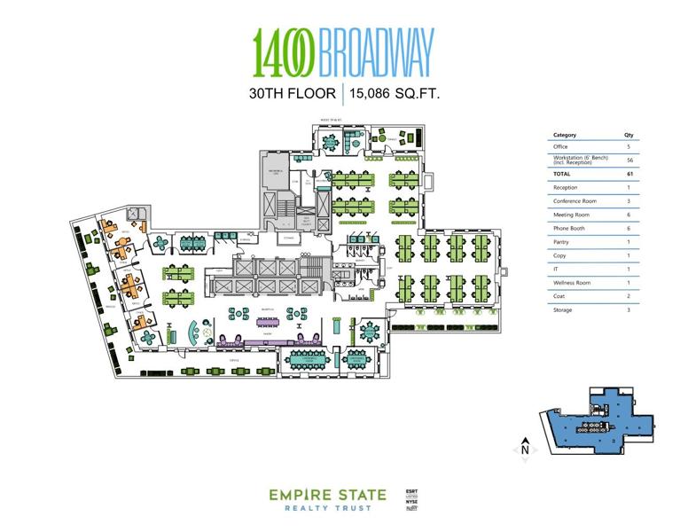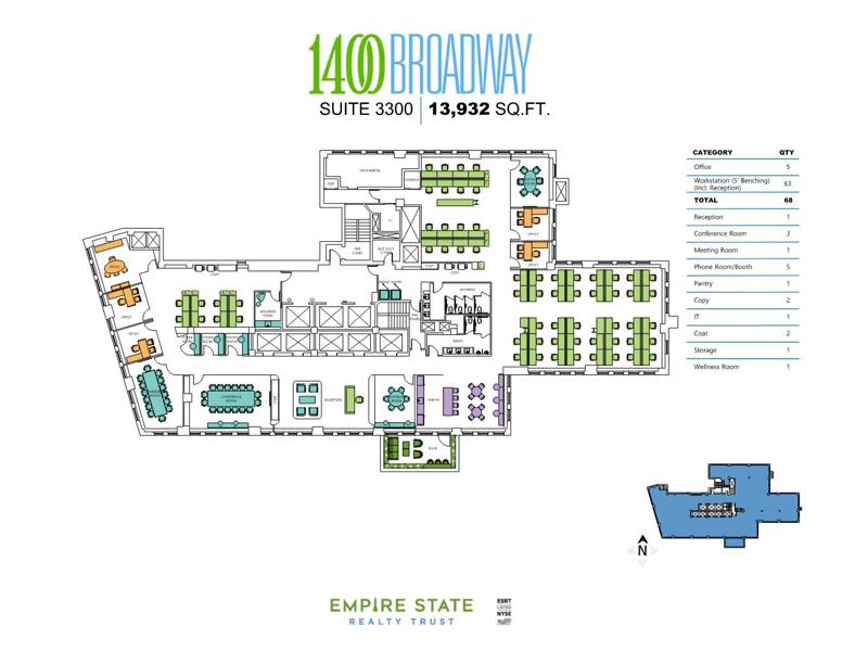 The buildings upgrade program includes a newly designed lobby by architect Fifield Piaker Elman, with new entrance doors and canopy, a new ceiling, new lighting, and two new concierge desks with 24/7 security, turnstiles and a tenant only lounge. Other renovations include new elevators, renovated air-conditioned public corridors and restrooms, new windows, and upgraded building-wide systems, including state-of-the-art electrical, plumbing, HVAC, and security. ESRT is the first portfolio in the Americas to be WELL Certified by the International WELL Building Institute. Additionally, ESRT is a Fitwel Champion, is fully powered by renewable wind energy, earned the 2024 ENERGY STAR Partner of the Year Award, and received Five Stars, an A rating, and the highest GRESB score of all Americas’ Listed Companies for two consecutive years. As a leader in sustainability, energy efficiency, and Indoor Environmental Quality, ESRT can help your client meet its corporate sustainability goals (100% of our NYC commercial portfolio is ENERGY STAR certified). ESRT supports these efforts with its own sustainability leadership and is publicly traded on the NYSE with a best-in-class balance sheet.