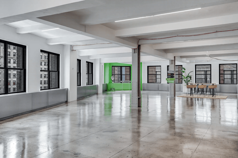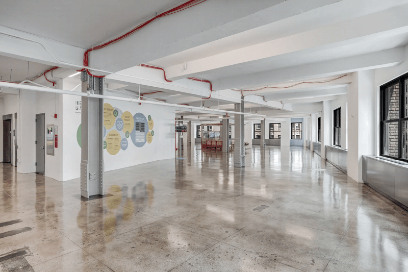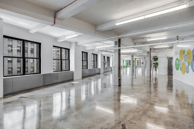 Corner unit in whitebox condition stripped columns, exposed ceiling, and polished concrete floor.