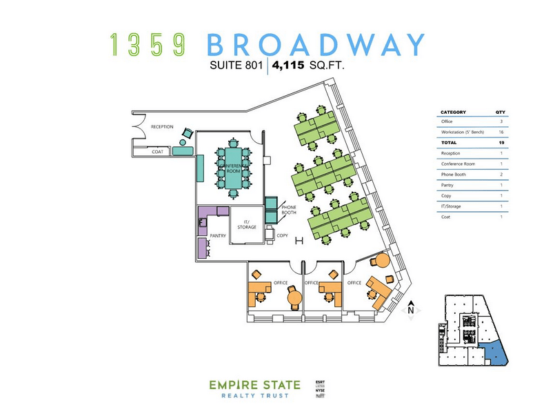 Additionally, ESRT is a Fitwel Champion, is fully powered by renewable wind energy, earned the 2024 ENERGY STAR Partner of the Year Award, and received Five Stars, an A rating, and the highest GRESB score of all Americas’ Listed Companies for two consecutive years. As a leader in sustainability, energy efficiency, and Indoor Environmental Quality, ESRT can help your client meet its corporate sustainability goals (100% of our NYC commercial portfolio is ENERGY STAR certified). ESRT supports these efforts with its own sustainability leadership and is publicly traded on the NYSE with a best-in-class balance sheet.