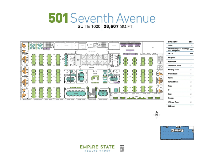 The property includes a fully modernized lobby, new elevators and windows, renovated air-conditioned public corridors and restrooms, efficient side-core floor plates, a new rooftop lounge with indoor and outdoor seating, and upgraded building-wide systems, including state-of-the-art electrical, plumbing, HVAC, and security. ESRT is the first portfolio in the Americas to be WELL Certified by the International WELL Building Institute. Additionally, ESRT is a Fitwel Champion, is fully powered by renewable wind energy, earned the 2024 ENERGY STAR Partner of the Year Award, and received Five Stars, an A rating, and the highest GRESB score of all Americas’ Listed Companies for two consecutive years. As a leader in sustainability, energy efficiency, and Indoor Environmental Quality, ESRT can help your client meet its corporate sustainability goals (100% of our NYC commercial portfolio is ENERGY STAR certified). ESRT supports these efforts with its own sustainability leadership and is publicly traded on the NYSE with a best-in-class balance sheet.