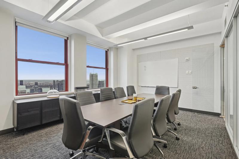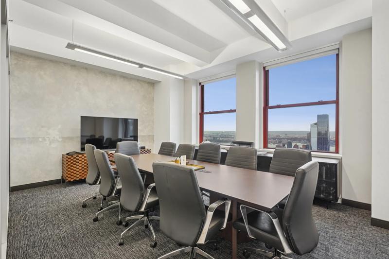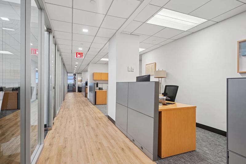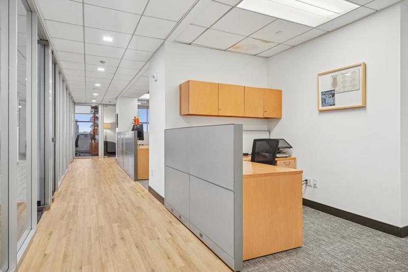Pre-built suite with 13 offices, 1 conference room, and space for 13 workstations. The space has western views and a direct presence off the elevators. The suite features glass-fronted offices and conference room with stainless steel trim, plus a signature pantry and carpet throughout.