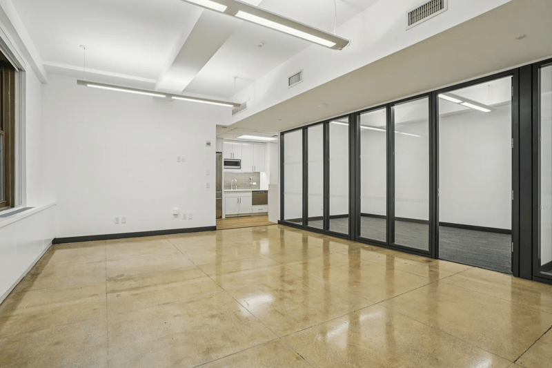 Pre-built with 1 conference room and 1 meeting room and open space for 8 workstations and a high end pantry. Bright southern exposure. This space features glass fronted offices and conference rooms with wood trim, exposed ceilings and polished concrete floors.