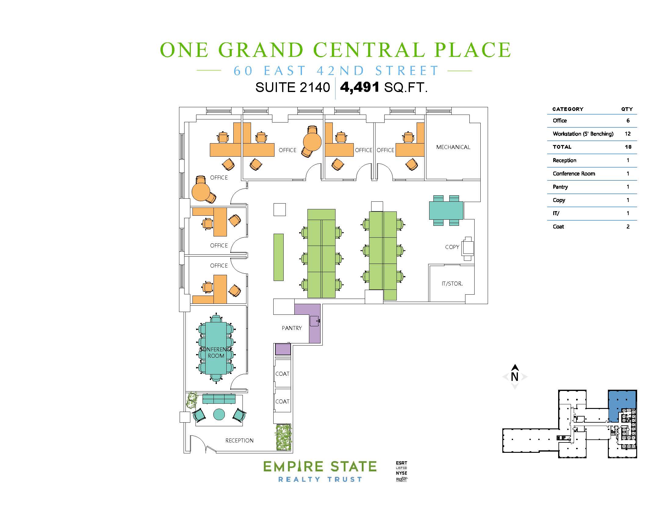 The state-of-the-art property has completed upgrades to its windows, elevators, air-conditioned public corridors and restrooms, and building-wide systems, including electrical, plumbing, HVAC, and security. ESRT is the first portfolio in the Americas to be WELL Certified by the International WELL Building Institute. Additionally, ESRT is a Fitwel Champion, is fully powered by renewable wind energy, earned the 2024 ENERGY STAR Partner of the Year Award, and received Five Stars, an A rating, and the highest GRESB score of all Americas’ Listed Companies for two consecutive years. As a leader in sustainability, energy efficiency, and Indoor Environmental Quality, ESRT can help your client meet its corporate sustainability goals (100% of our NYC commercial portfolio is ENERGY STAR certified). ESRT supports these efforts with its own sustainability leadership and is publicly traded on the NYSE with a best-in-class balance sheet.